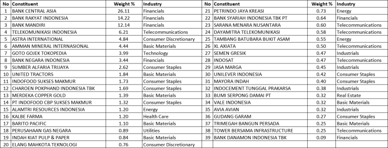 Dengan Bank Central Asia sebagai konstituen terbesarnya dan saham-saham terbaik dari setiap sektor yang terdaftar di Bursa Efek Indonesia (BEI)